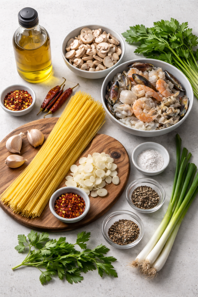 Ingredients for Spicy Garlic Chili Seafood Pasta